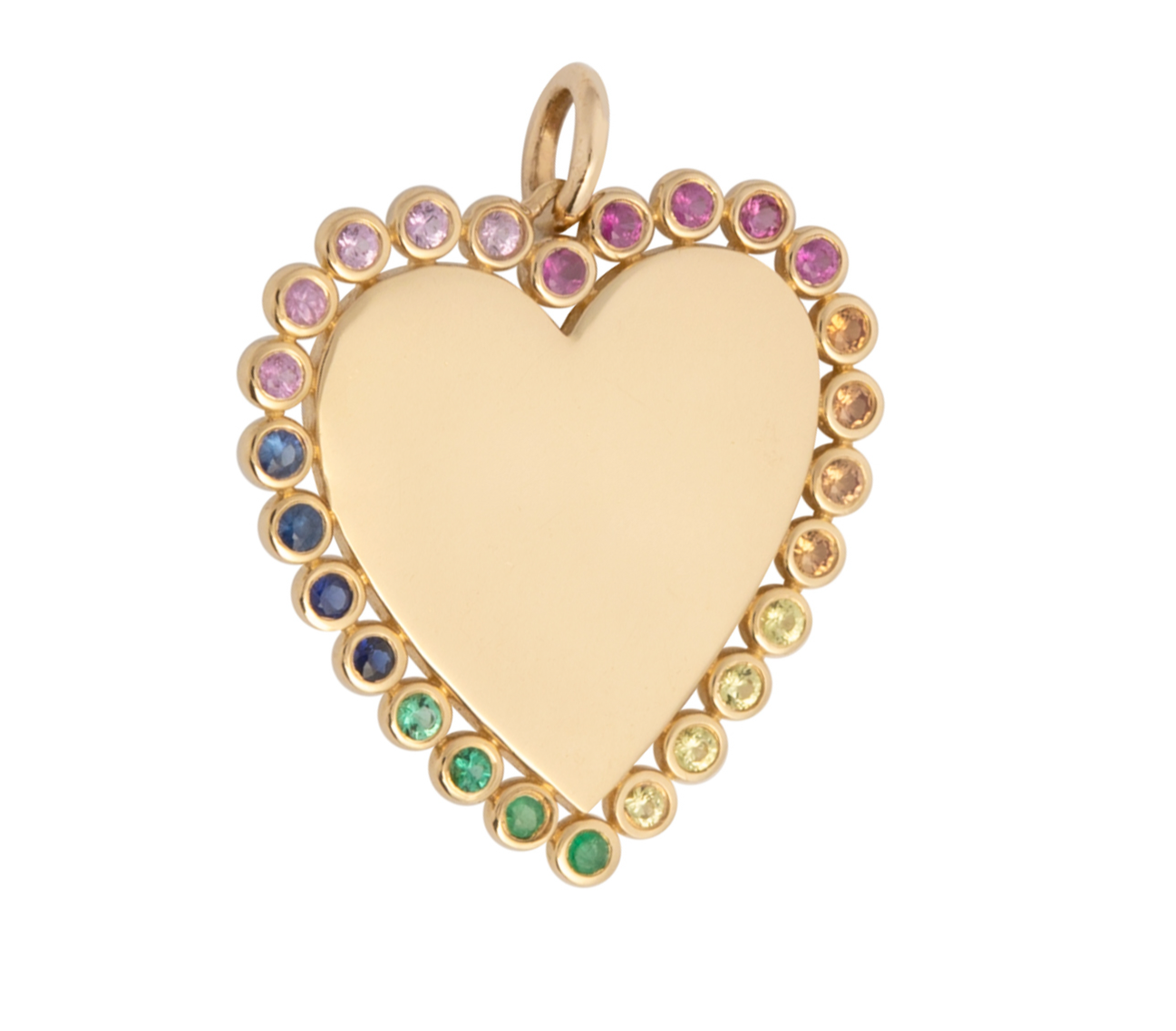 A gold pendant featuring a heart shape with diamond paving and multicolored sapphire accents around the edge.