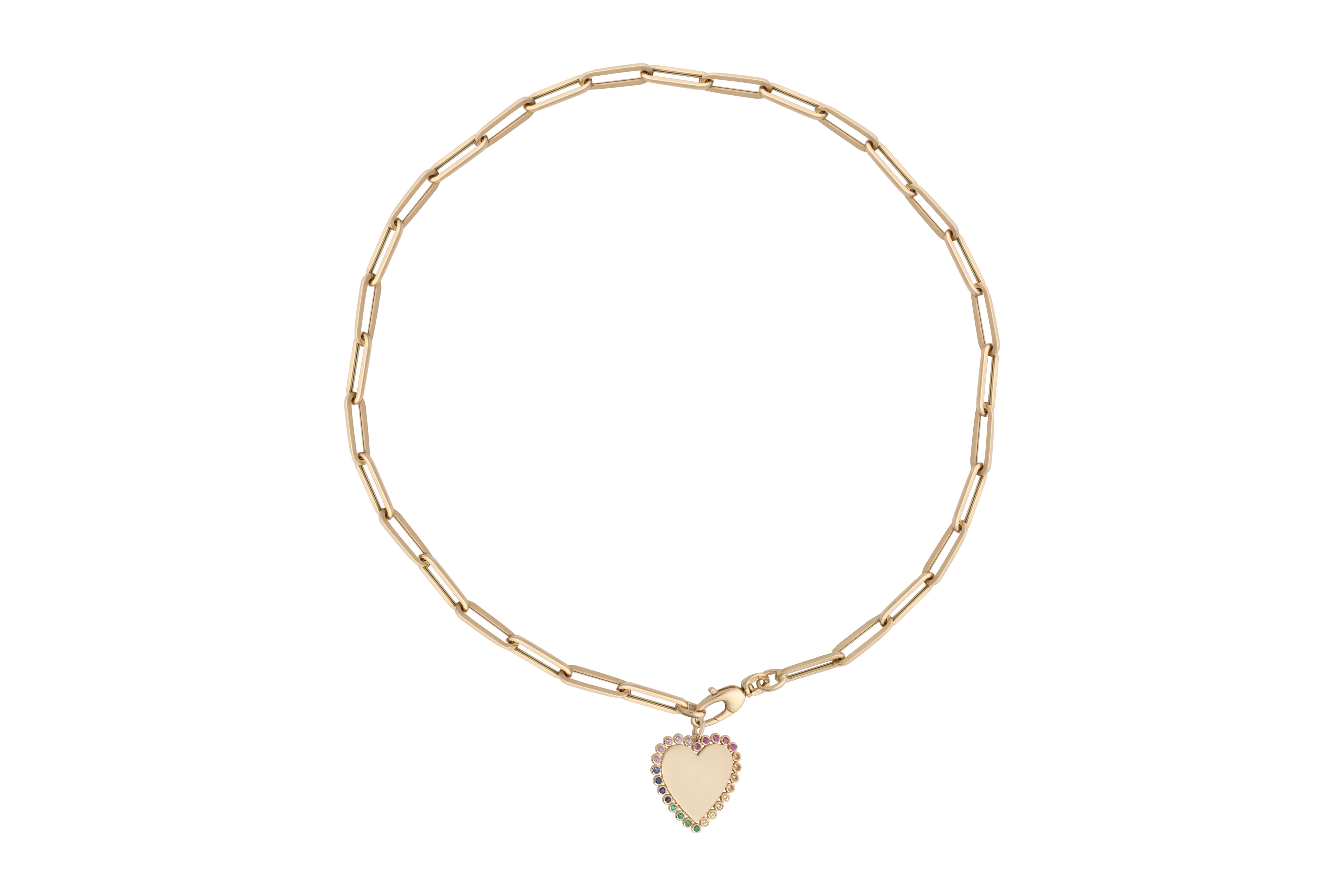 A white background with a 14k gold paperclip chain with a gold and diamond pendant bail attaching a Multi-Colored Sapphire and Diamond Heart Pendant.