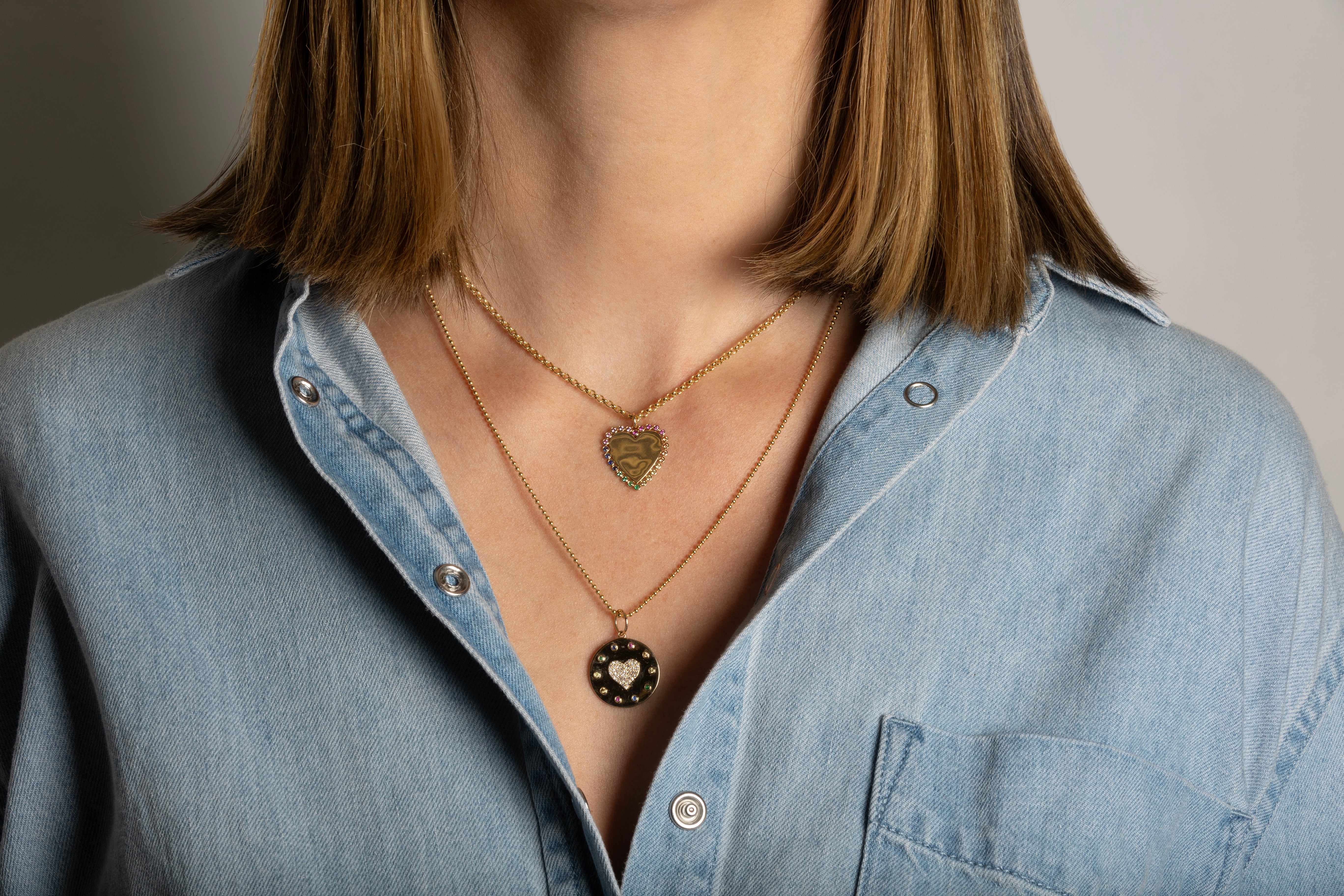 A person wearing a mini rolo chain with diamond and emerald roundel beads and a  chunky 14k gold lariat chain with a beveled heart pendant attached.