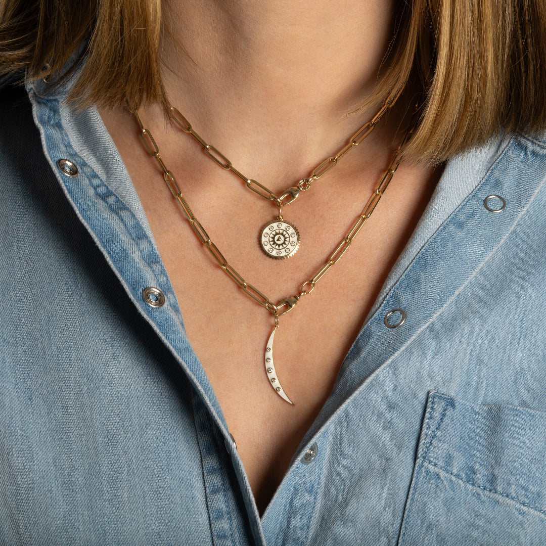 Elevate your style with our exquisite White Enamel and Diamond Pendant. Handcrafted with 14k gold and adorned with sparkling diamonds, this pendant exudes elegance and luxury. It pairs especially well with the Crescent Moon White Enamel and Diamond Pendant.  Attach to chunkier chains with a pendant bail or via the necklace clasp.